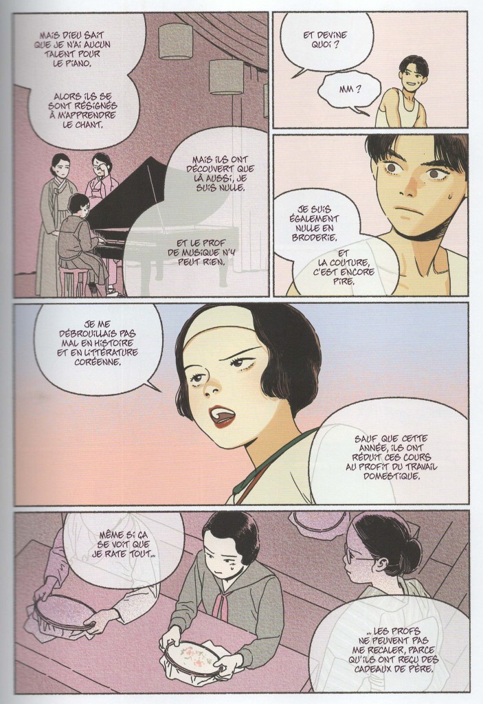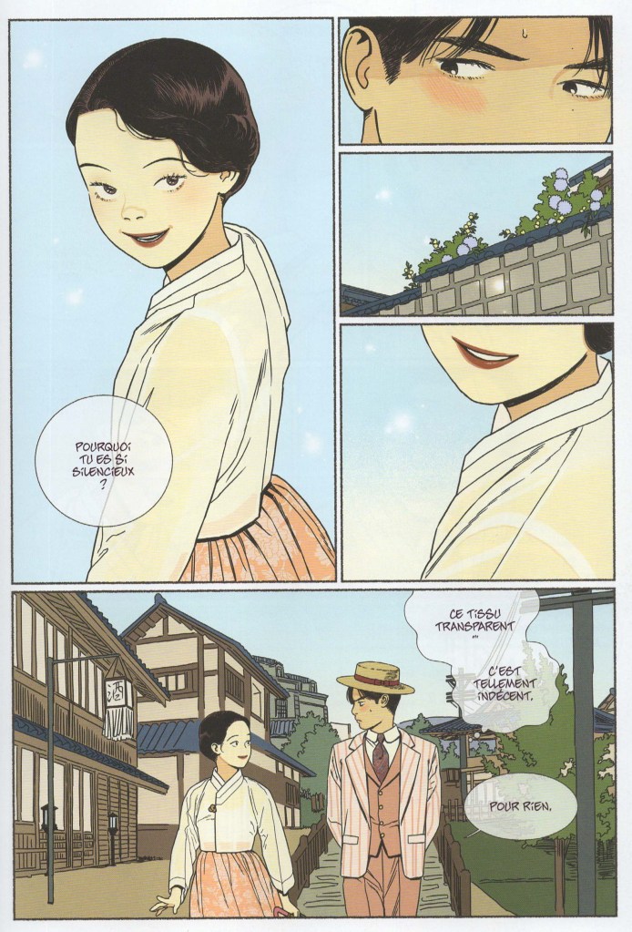 En plus de l’incroyable beauté de l’ouvrage, son scénario nous emporte facilement dans cette Corée tout juste conquise, encore meurtrie par la violence des affrontements qu’elle a connus. Loin d’être manichéen, le récit aborde les bons et les mauvais côtés de la tradition coréenne comme de l’incursion de la culture occidentale. Ainsi, si les nouvelles modes signent une libération des femmes, elles s’accompagnent aussi d’une forte pression sociale. De la même façon, alors que l’arrivée du Japon à fait disparaitre le système de classe inégale qui régnait dans le pays, il a aussi amené une répression violente de sa population par la nouvelle police nipponne.