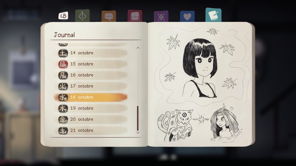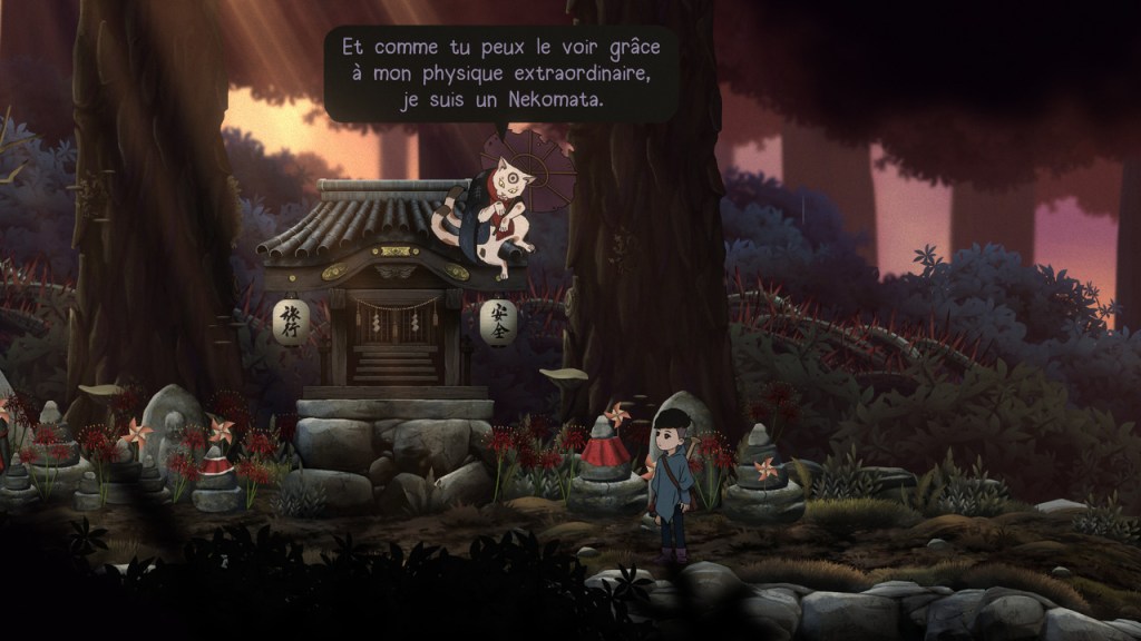 Dans ses phases d’aventure, le jeu offre tout un pan de la culture et du folklore traditionnel japonais. Cela passe par les autels shintoïstes auprès desquels il est possible de se recueillir pour sauvegarder et récupérer de la santé, mais également par les nombreuses créatures qui rythment le périple d’Ayumi. Depuis Mirei, une kitsune au service des dieux, jusqu’à Nekotaro le nekomata amoureux de littérature. Les environnements magnifiquement détaillés sont eux aussi porteurs de cette ambiance mystique, grâce à des effets de flou étudiés et une myriade de petits détails qui renforcent l’immersion. D’ailleurs, si certaines captures d’écran pourraient faire croire à tort que le design du jeu est simpliste, il n’en est rien. Il suffit d’explorer la galerie de croquis proposée dans les menus pour s’en convaincre. La musique n’est pas non plus en reste, et ponctue habilement cette épopée narrative pleine d’émotion.