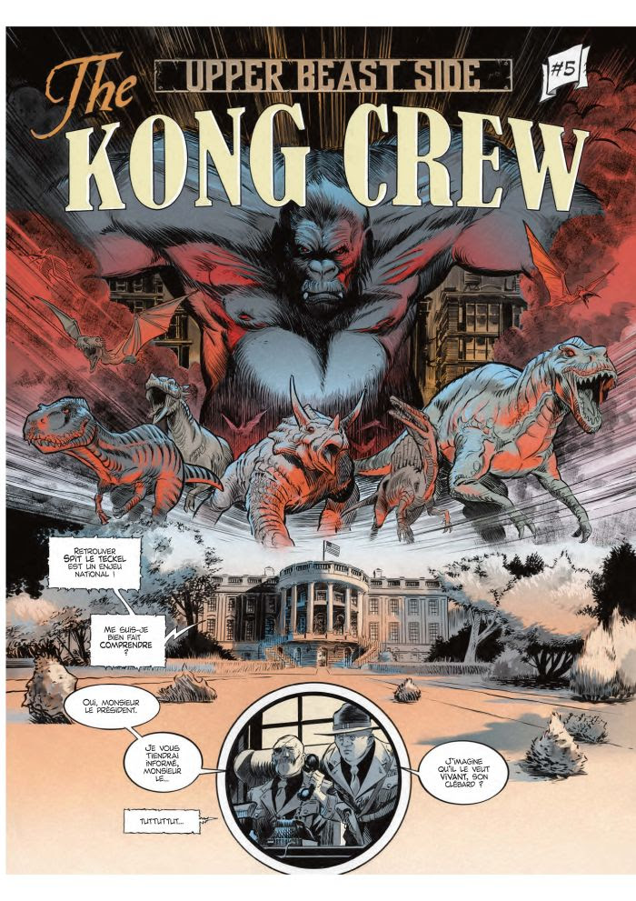 « L’univers de The Kong Crew permet de dessiner une faune préhistorique délirante. Le contraste entre les dinosaures et la ville de Manhattan, figée dans la jungle, ajoute une ambiance très baroque. L’idée première de cette série est de réunir les codes des films fantastiques des années 1940 et 1950 dans un microcosme. La bande dessinée permet de tout tenter sans limite de moyens, sinon l’imagination que l’on s’autorise. Ainsi, créer de toutes pièces une poursuite entre un T-Rex, un ptérodactyle, un gorille, un tigre et un Hot Rod ne pose aucun problème et on peut même y ajouter un teckel ! »