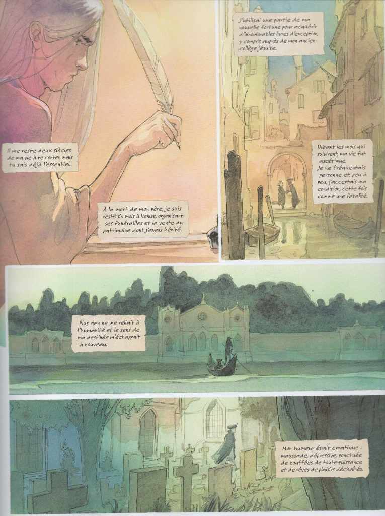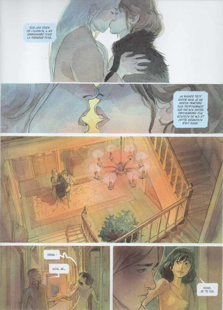 L’échange épistolaire entre Anna et Adrian est rendu de manière parfaitement claire grâce aux choix de couleurs des bulles de textes et à la mise en case soignée. De même, le romantisme et le souffle poétique de récit original se retrouvent ici sublimés par l’aquarelle de Yannick Corboz. Un trait fluide, lumineux, doux et puissant, à l’image de cette histoire qui nous fait voyager entre les pays et les époques. Malgré les drames qui l’ont jonchée, la vie d’Adrian est riche d’aventures et d’expériences, pleine d’une diversité parfaitement exprimée par les couleurs de l’artiste. Des ambiances vaporeuses des fumeries d’opium à la grisaille froide des rues de New York, la lumière offre elle aussi un rendu tout en délicatesse. On sent, à travers l’imagerie déployée par Corboz, qu’il a parfaitement saisi la synesthésie de l’amour et toute la dualité du personnage de van Gott.