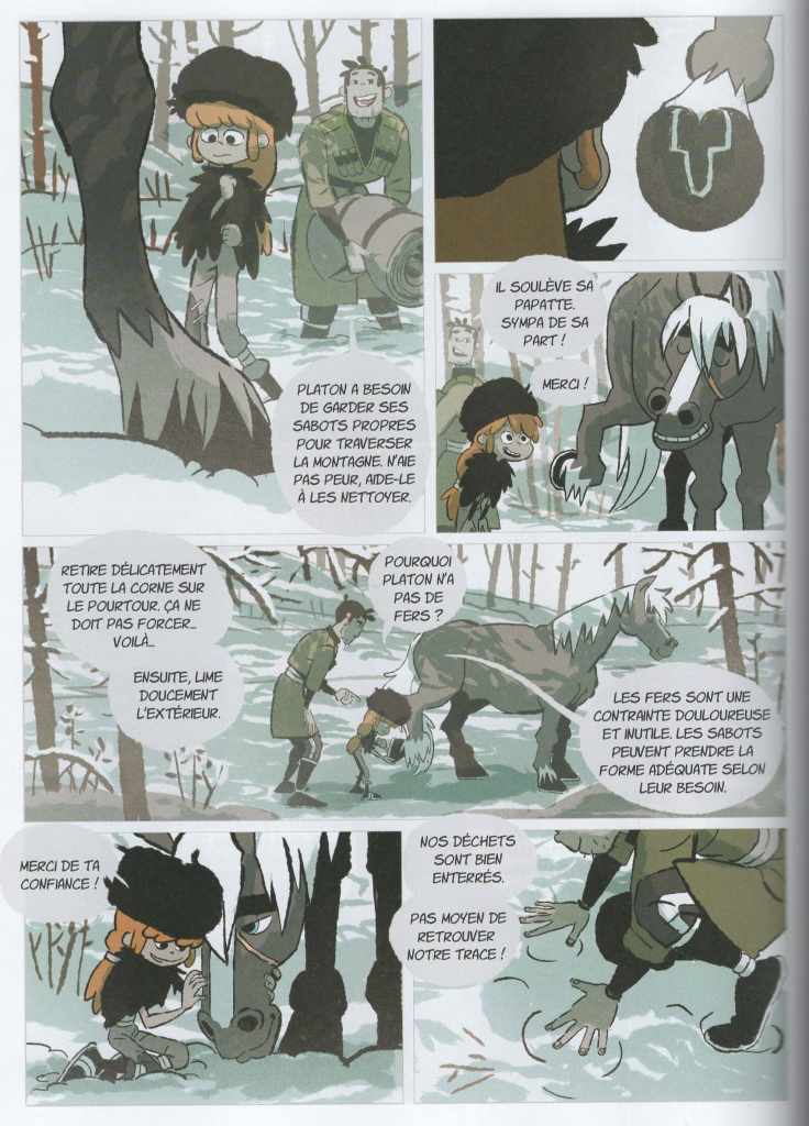 Le duo formé par Nadya et Yuri fonctionne très bien. D’autant que l’histoire ne va jamais trop vite, préférant prendre son temps pour mettre en place ses intrigues et ses rebondissements, et surtout pour laisser le temps à ses deux protagonistes de s’apprivoiser. Les personnages secondaires ne sont pas en reste et si l’on y trouve quelques influences des contes Disney (le sidekick animal, le méchant nihiliste et sociopathe…), ils conservent tous cette dualité qui les rend profondément crédibles. Quant à l’aspect fantastique, il apparaît par petites touches et se montre discret, particulièrement dans la première partie du récit, pour laisser toute la place à l’aventure et aux personnages. Pour autant, il n’est pas là pour offrir uniquement une caution mystique et culturelle au récit, au contraire, il sert à apporter un final inattendu, propice à la réflexion et très intéressant.