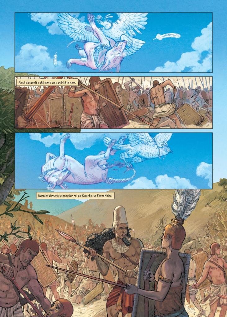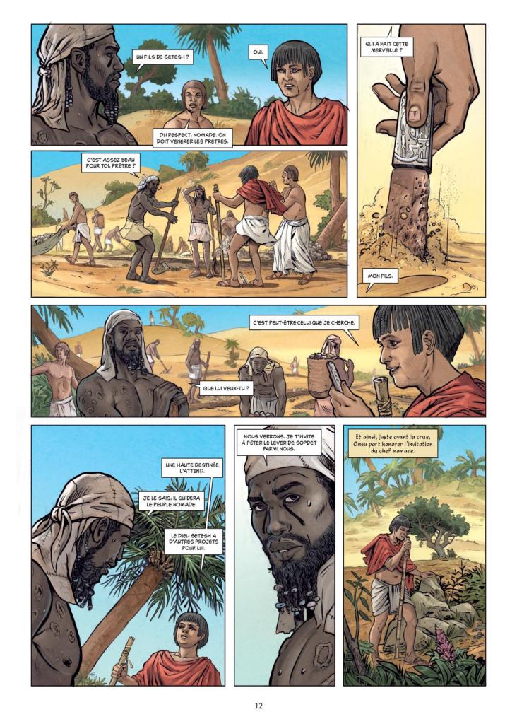 En revanche les dessins de Giulia Pellegrini font honneur à l’art et à la culture d’Égypte antique. C’est riche, coloré, lumineux, les paysages désertiques sont loin d’être monotones et les passages plus mystiques, qui mettent en scène les rêves et les dieux, sont plutôt inspirés. Il se dégage même quelque chose d’assez poétique de l’étude des étoiles d’Im-Hotep et des autres prêtres de Setesh.