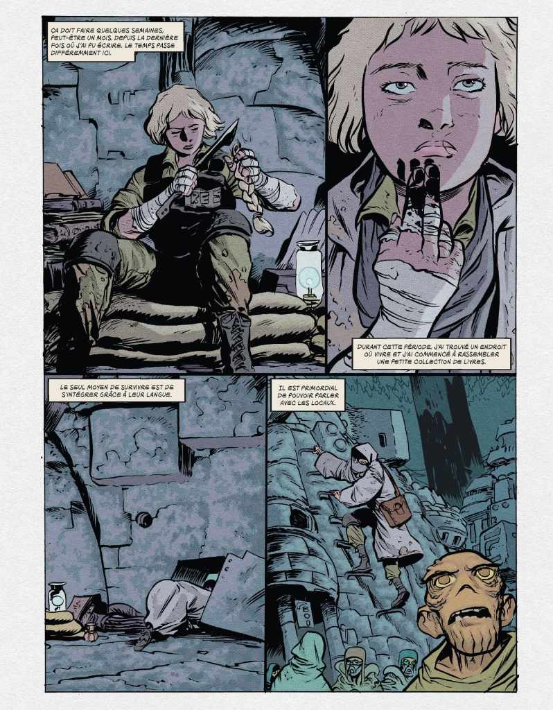 Dès les premières pages, les couleurs de Bill Crabtree (Ant-Man, Avengers, Invincible…) subliment les explosions et les gerbes de sang ! La fuite effrénée de Robin passe par des charniers puants et des cités crasseuses, entrecoupée de moment où elle trouve refuge chez d’autres opprimés locaux, ce qui lui permet d’apprendre peu à peu la langue, la culture et les codes qui régissent Terminus. De proie, elle passe bientôt à espionne, puisqu’elle s’intègre et se fond petit à petit dans la masse hétéroclite qui peuple la planète. L’occasion de montrer que, peu importe les peuples et les endroits, certains mécanismes de domination et d’oppression sont universels.