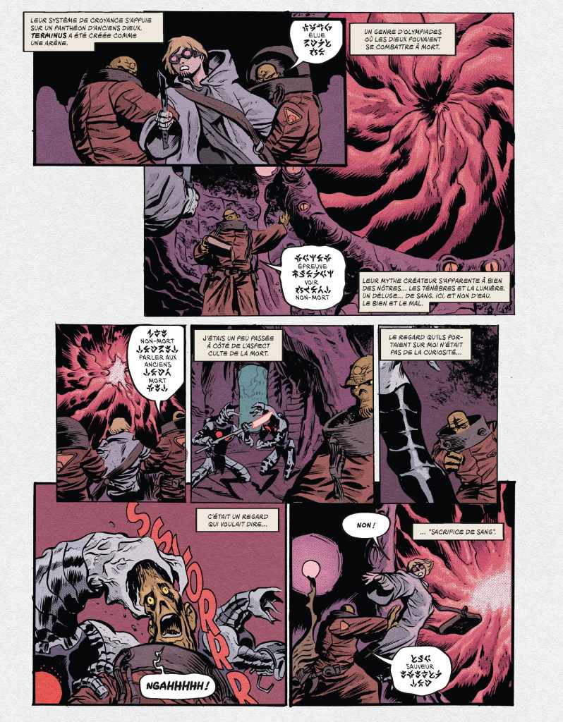 Malgré son univers violent et sombre, le récit se permet de parodier les œuvres d’actions bourrées de testostérone des années 1990. Dans la manière de présenter son équipe de bourrins au début, qui rappelle celle de films tels que Predators, et la façon viriliste de ces derniers de traiter Robin. Cette dernière ne manque d’ailleurs pas de souligner qu’elle est loin d’être une faible femme, chose que le récit démontre parfaitement. Plus tard, l’aventure se mue en épopée lovecraftienne, avec ses colosses de chair, ses anciens dieux meurtriers et ses sectes monstrueuses. Loin des cantinas de Star Wars ou des conglomérats spatiaux de Mass Effect, Terminus est une planète sale, dérangeante, difficilement appréhendable pour un esprit terrien.