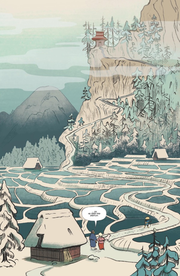 Du côté des graphismes, Isabella Mazzanti pioche à la fois dans les estampes d’Hokusai et le croquis aquarellé, ce qui donne tout son cachet à l’œuvre et renforce l’impression d’évoluer dans un univers entre conte traditionnel et revisite moderne. L’imagerie est puissante, inspirée.