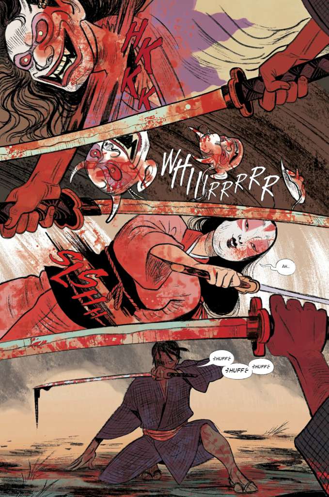 Si Hitomi s’illustre très bien dans ses scènes de combats, il propose aussi de beaux moments contemplatifs, à l’aide d’illustrations pleine page qui subliment le talent de la coloriste Valentina Napolitano. Bien qu’il n’ait pas pour vocation d’être historique, le comic nous offre tout de même une vision juste et crédible du Japon de l’ère Tenshô.