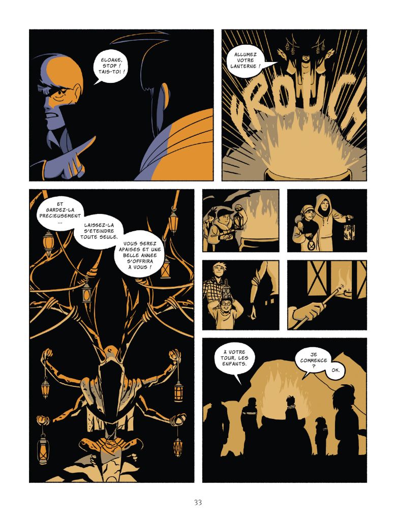Et comme dans un film là aussi, Jean-Étienne joue avec le hors champ pour suggérer des créatures et des scènes, qui s’invitent d’abord dans l’imagination des lecteur·ices avant de gagner les pages. On devine une monstruosité au gros plan sur le visage terrorisé d’un personnage, tout comme on imagine quel genre d’ambiance règne au sein de la famille d’Eloane aux regards en coin et aux sous-entendus échangés par ses membres. Le secret, thème phare du récit, se devine dans un dialogue murmuré, dans les traditions de l’île que ses enfants évoquent en riant, dans ces échanges de regard entre un frère et une sœur qui savent, mais ne disent rien…