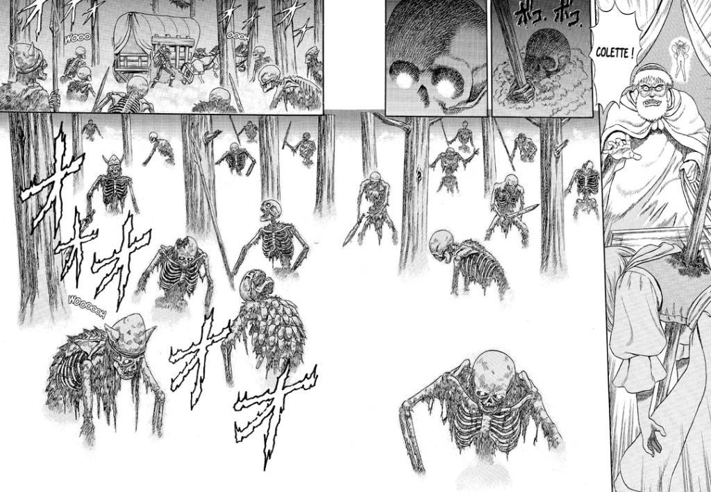 La découpe de l’action, dynamique et détaillée, montre déjà les mécaniques du processus Miura, notamment avec des doubles planches chargées d’une puissance épique incroyable ou dévoilant des créatures au design cauchemardesque (Koca). Pas de doute, la recette Berserk est là et il ne suffira que de quelques tomes pour la voir atteindre son summum. Comme le dit si bien l’elfe Puck qui accompagne notre héros tout au long de l’aventure, à la fin du premier chapitre : « Un Berserk…«