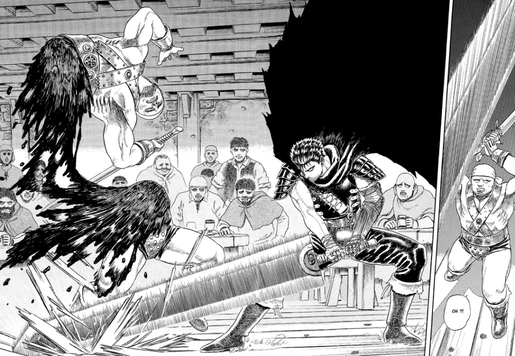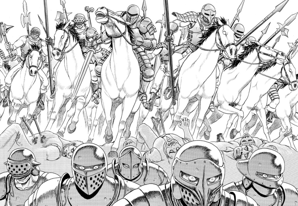 C’est d’ailleurs l’autre grand point fort du manga que de proposer une écriture sophistiquée, ne tombant jamais dans la facilité de personnages stéréotypés, pour plutôt tisser une vaste toile narrative explorant les thématiques de la religion, de la vie et de la mort, de l’ambition, des rêves, de l’amour et de la guerre. La relation entre Guts et Griffith est aussi complexe que tragique : d’abord fondée sur une camaraderie réciproque, la trahison de Griffith crée un fossé que rien ne peut combler et une haine viscérale que Guts lui vouera jusqu’au bout, dans sa quête de liberté individuelle face à des ambitions divines aux proportions titanesques.