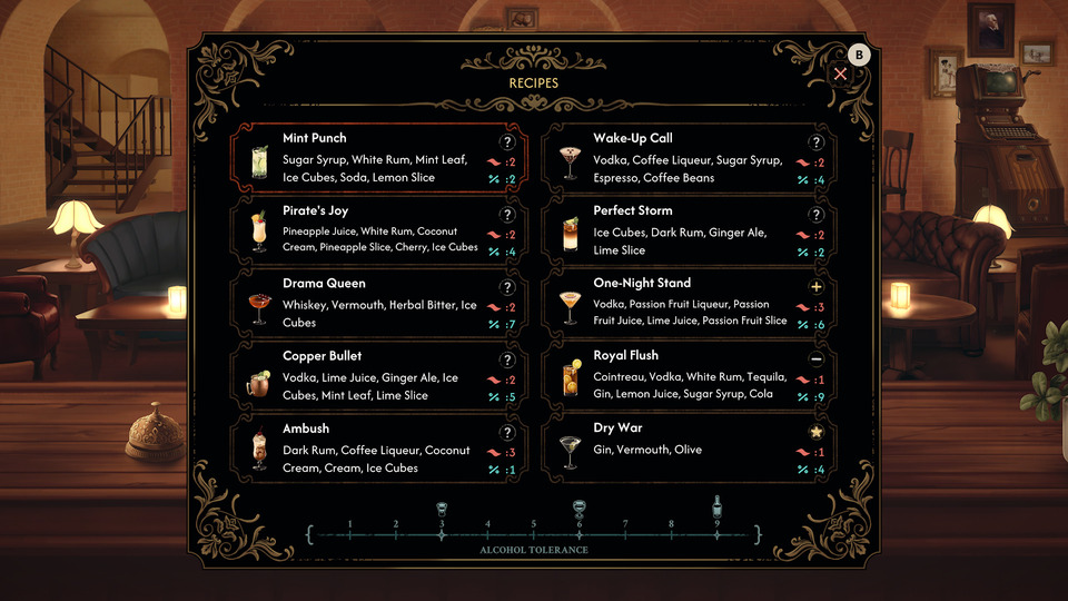 Ces derniers sont aussi bien issus de la bourgeoisie que des classes populaires de la ville, mais ils ont pour point commun d’être plutôt loquaces après quelques verres. Le constable Hugo Mertens compte bien en profiter, puisqu’il accepte de fermer les yeux sur votre établissement si vous l’aidez à résoudre le meurtre d’une jeune femme, dont le coupable pourrait bien se trouver parmi vos consommateurs. Il va falloir préparer de délicieux cocktails, mettre à profit vos compétences sociales et surtout, la jouer fine pour résoudre ce mystère.
