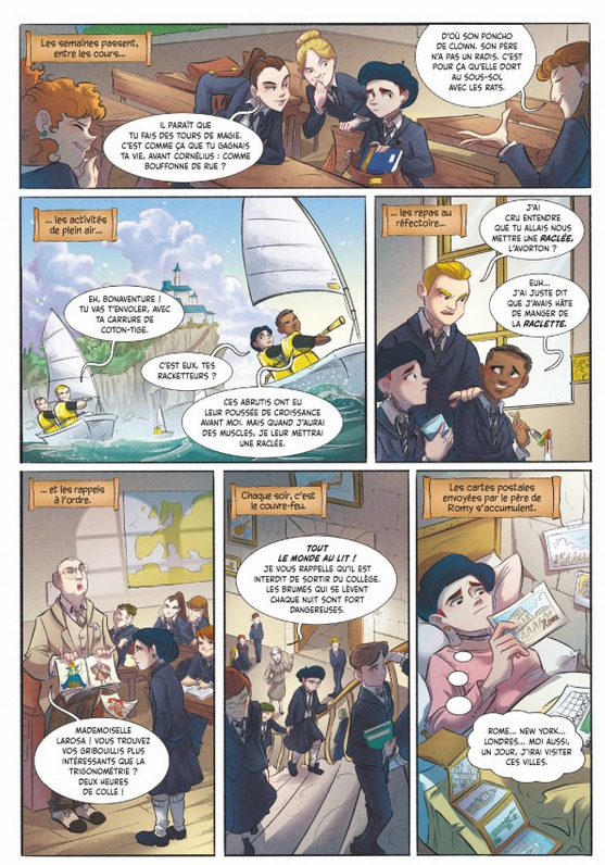 Si les personnages sont souvent issus des poncifs de la teenage story (la pimbêche, l’institutrice rigide, le sidekick rigolo…), ils sont superbement mis en valeur par les dessins de Gloria Marino et la mise en scène de Gabriel Bagnoli. Les couleurs sont également sublimes et donnent tout le ton des 48 pages de ce premier tome. Nous avons particulièrement apprécié le travail qui a été fait sur la lumière, un élément capital dans un monde où les heures sont fixes en fonction des régions.