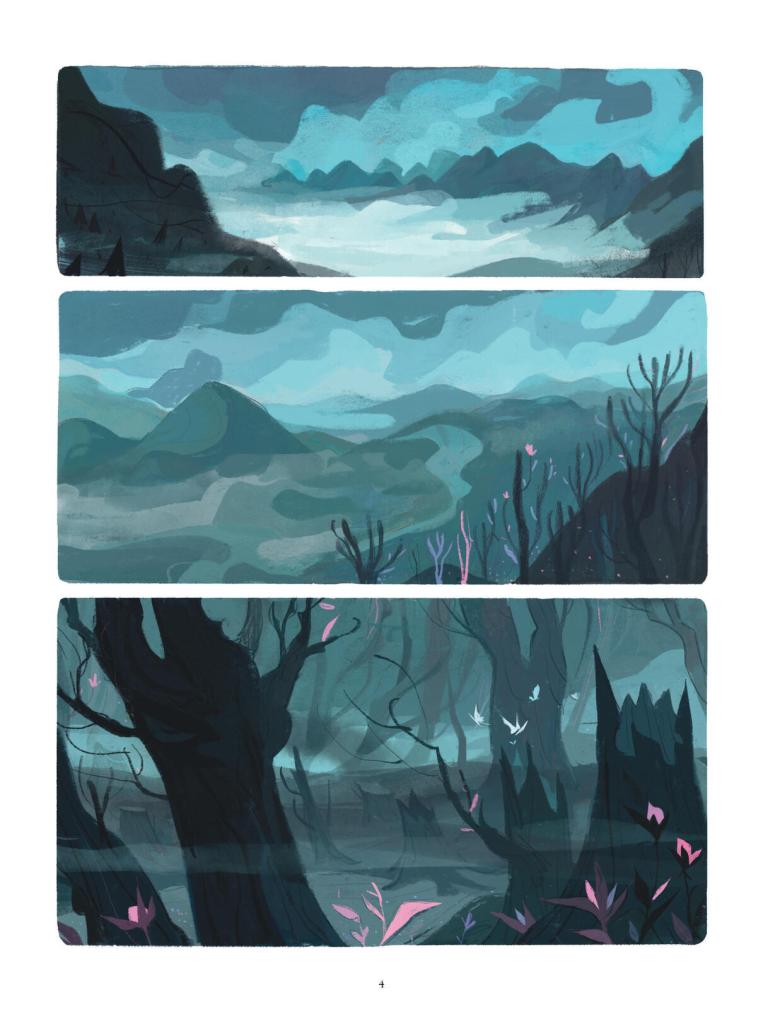 Ce qui frappe d’abord ce sont les couleurs. D’une justesse et d’un éclat presque synesthésiques. On y ressent la chaleur ambrée des flammes, on imagine croître sans peine de jeunes pousses peintes de mille nuances de vert, on subit le froid et l’oppression d’une pluie grisâtre, barrant une page de ses traits humides. Puis il y a le dessin, pour lequel Stéphane Fert possède un style bien à lui, capable d’une simplicité bienvenue lorsqu’il s’agit d’évoquer des lieux et des personnages en faisant appel à l’imagination du lecteur, comme de créer des scènes foisonnantes de détails et d’une beauté à couper le souffle. Parfois, l’histoire se passe de mots pour s’exprimer uniquement à travers deux mains qui se resserrent, un souffle dans les feuilles d’un arbre, un sourire qui naît sur un visage… C’est beau, c’est poétique et c’est incroyablement bouleversant.