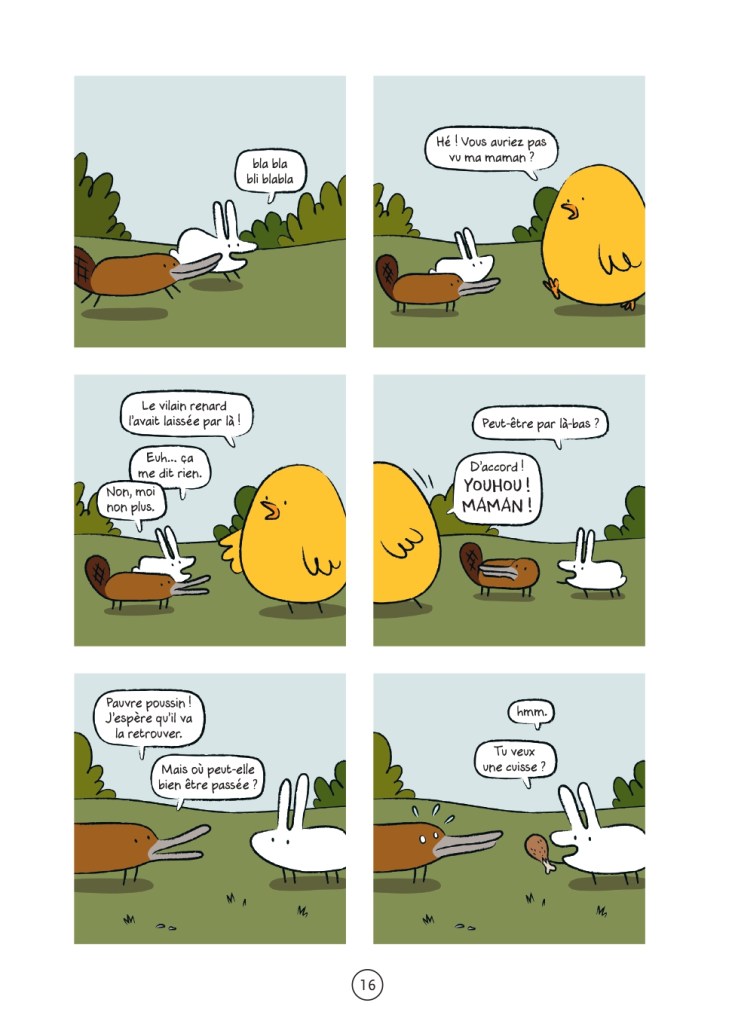 Prenez un renard un peu bête, un poussin obèse, un ornithorynque naïf, un duo de gastéropodes accro à la drogue, une famille de beloup (mi-belette, mi-loup) et un lapin persuadé d’être un monstre sanguinaire… Voilà un décor digne d’une version trash des fables de La Fontaine, où des péripéties aussi drôles qu’absurdes s’enchaînent pour notre plus grand plaisir. Ne cherchez pas de parallèles profonds avec notre propre société ou de réflexions alambiquées sur la condition humaine, nous sommes là pour nous amuser.