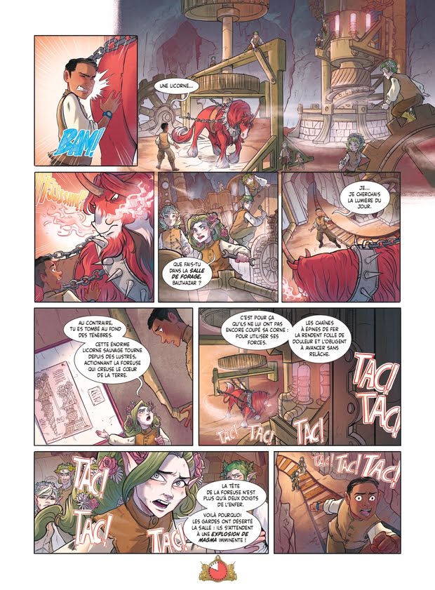 Tout comme Graine-de-Folie, Cœur-Flambant casse l’image mignonne et poétique de la licorne classique au profit de la carrure puissante et musculeuse d’un cheval de trait, ainsi qu’une capacité à souffler le feu digne d’un dragon ! Aussi noble que farouche, la créature ne se laisse pas facilement apprivoiser et il faudra à Balthazar tout son courage pour oser aller la libérer, alors qu’il est seul et entouré d’ennemis. Cette aventure est d’ailleurs l’occasion d’en apprendre beaucoup sur la méchante Carabosse et ses sinistres intentions, et de lui découvrir des alliés pour le moins… inattendus ! Allez, plus que deux licornes et leurs licorniers à découvrir, mais, pour ça, il faudra attendre les prochains tomes de cette tétralogie.