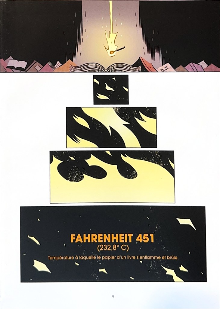 Victor Santos choisit de rester au plus près de la trame originelle. Le parcours intérieur de Montag, ses doutes grandissants, la présence obsédante du feu et la tension entre une société autoritaire et la recherche fragile de liberté demeurent au cœur du récit. Bien que certains passages, plus philosophiques et méditatifs dans le roman, soient condensés, ce choix permet de préserver la fluidité narrative et de s’adapter au rythme visuel qu’impose le format bande dessinée, sans trahir l’esprit de Bradbury.