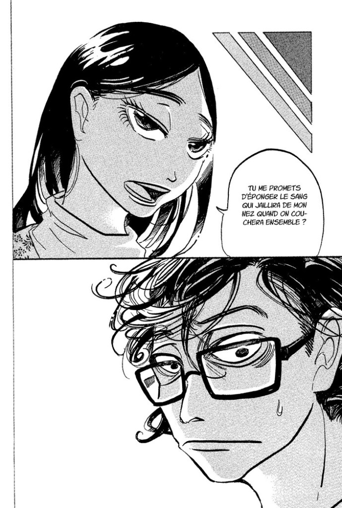 Malheureusement, désespérée par le dégoût que sa situation provoque, elle ne se montre pas très sélective en matière d’hommes et tombe sans arrêt sur des types qu’elle terrorise ou des goujats qui la méprisent. Ce sentiment de rejet va l’amener à réfléchir aux origines de sa phobie et aux véritables causes de son mal-être. Dans une introspection crédible et bien amenée, elle déroule le fil de ses traumas, de ses déceptions et fait un vrai travail de psychologue pour comprendre comment changer sa vie. Au-delà de son aspect loufoque, le manga porte donc un message bienvenu sur l’estime de soi et la nécessité d’accepter de se confronter à ses peurs pour les dépasser.