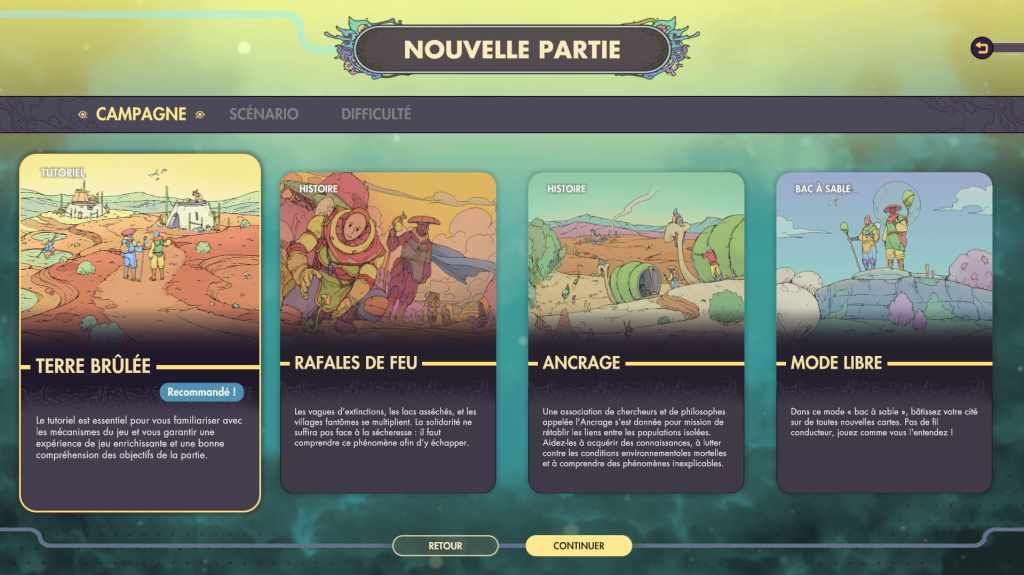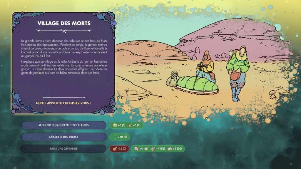 Rencontrer d’autres colonies durant un voyage permettra de débloquer des options d’échanges de ressources, bien utiles lorsque l’on peine à obtenir un élément particulier nécessaire à la progression. Ces rencontres sont souvent mises en scène de manière scénaristique et permettent d’enrichir l’histoire de cette mystérieuse planète et de ses habitants. Synergy propose d’ailleurs deux (longs) scénarios, en plus d’un tutoriel pour maîtriser les bases du jeu et d’un mode bac à sable. De quoi occuper les plus complétistes près de soixante-quinze heures.