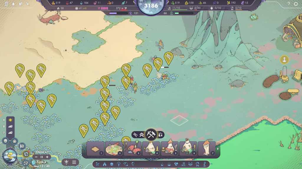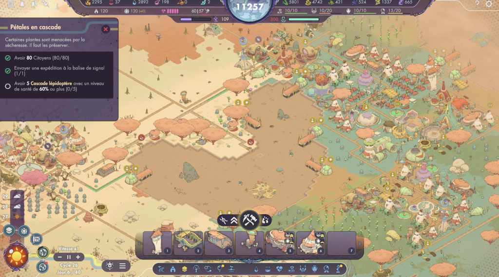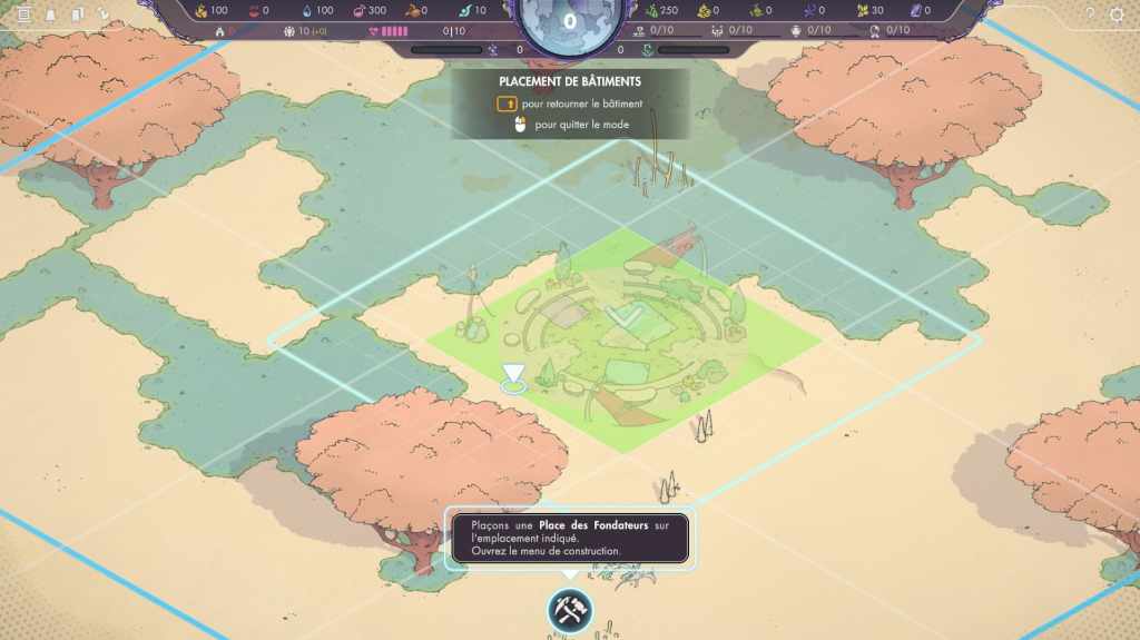 La place des fondateurs, autour de laquelle va s’organiser la construction de la cité, offre divers bonus aux bâtiments situés dans son rayon d’action. Plus tard, il sera possible de multiplier les places afin de créer des quartiers différents, consacrés à des domaines particuliers (habitation, artisanat, recherche…), mais, pour l’instant, nos options se limitent à quelques tentes pour abriter nos survivants, un poste de travail pour les cueilleuses et les cueilleurs, ainsi que des lieux de stockage pour l’eau et la nourriture. Il est d’abord possible soit d’arracher les plantes environnantes, soit d’en récolter les fruits ou branches. Si la seconde option offre un rendement moindre, elle ne détruit pas les végétaux. Arracher toutes les pousses d’une même plante peut donc la faire totalement disparaître de la carte et signer la fin de la partie.