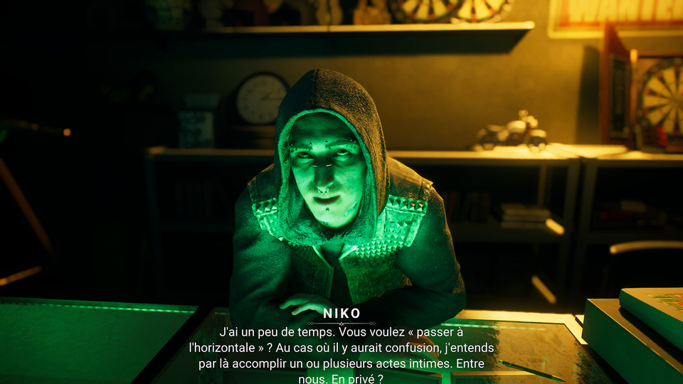 Si le scénario de Bloodlines 2 est plutôt réussi, il est regrettable que les quêtes forcent de nombreux aller-retour à travers la carte pour rallonger artificiellement la durée de vie du jeu (qui n’en avait nullement besoin). Les missions annexes proposées par les différents chefs de clans de Seattle – les mêmes qui offrent de nouveaux pouvoirs à Phyre – sont plus concises, mais elles reprennent toujours la même formule : Mme Thorn ne donne que des quêtes de livraisons, Niko demandera systématiquement de suivra la piste d’un humain à punir… Dommage. À noter que tous ces chefs de clans sont des personnages « romançables », mais l’option semble avoir été rajoutée uniquement pour cocher une case sur un cahier des charges tant les scènes « sexuelles » sont limitées et leurs dialogues navrants. Néanmoins, l’humour et l’ambiance film noir rétro apportés par Fabien sont particulièrement appréciables, tout comme la satire politique et sociale qui se dessine derrière certains dialogues et éléments du jeu.