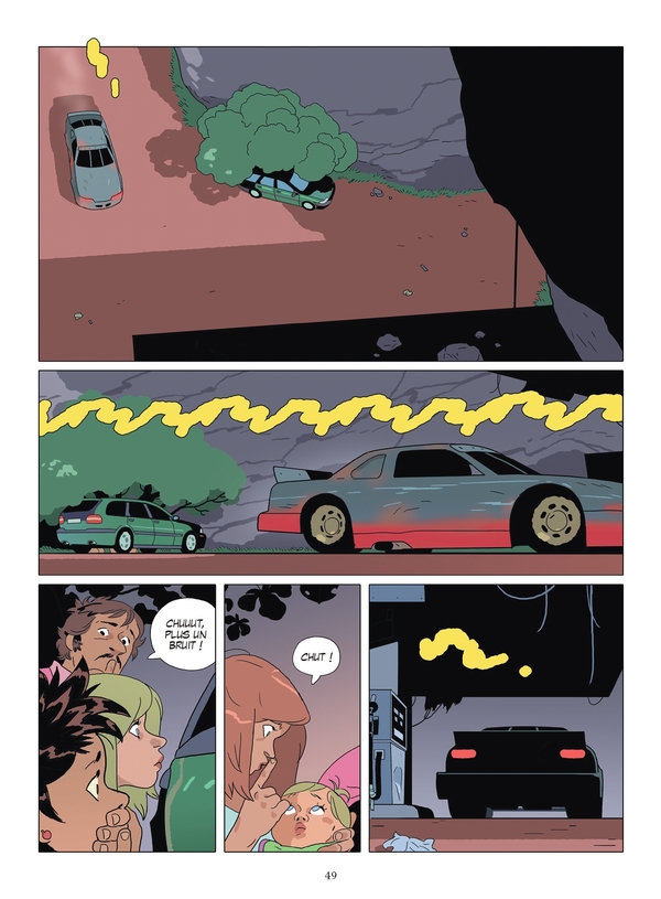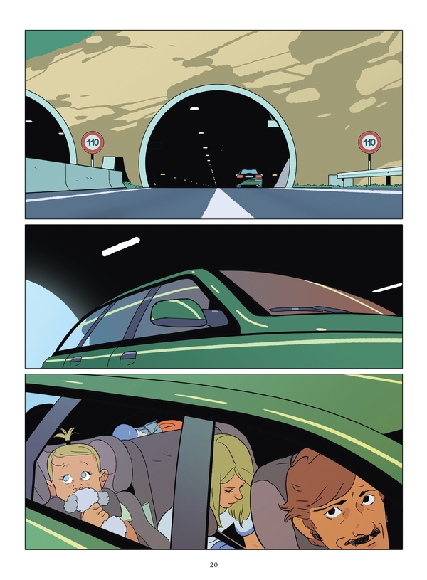 Tunnels fleure bon cette ambiance de vacances en famille où la seule activité est d’observer le paysage défiler le long de l’autoroute, notamment grâce à un travail sur la lumière particulièrement réussi. Sanlaville découpe ses cases comme il monterait un film et parvient à rendre les émotions de son groupe de héros, tout comme l’impact des chocs entre véhicules, presque palpables. Mais sa plus grande réussite, c’est de parvenir à instiller une ambiance angoissante en plein jour et avec le simple vrombissement d’un moteur.