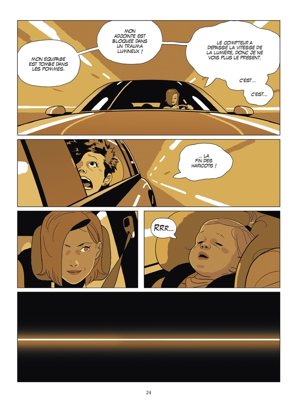 Plus que le danger lié à ses coureurs fous qui semblent les poursuivre, c’est bien la terreur qui gagne la famille qui fait monter la tension petit à petit. Lorsque le père craque à la vue du second cadavre de pilote, le récit bascule dans une folie digne du cinéma d’horreur. La fuite se double d’une quête de compréhension, car les mystérieux coureurs ne semblent avoir pour objectif que de s’entretuer avec leurs bolides. Loin d’offrir des réponses, Sanlaville transforme son histoire en drame au moment où l’on croit voir le bout du tunnel et se fend d’une ellipse pour jeter le flou sur le fin mot de son histoire. En optant pour une conclusion qui conserve une grande part de mystère, l’auteur frustre son public, mais ouvre aussi le champ des possibles. Un choix audacieux, mais risqué.