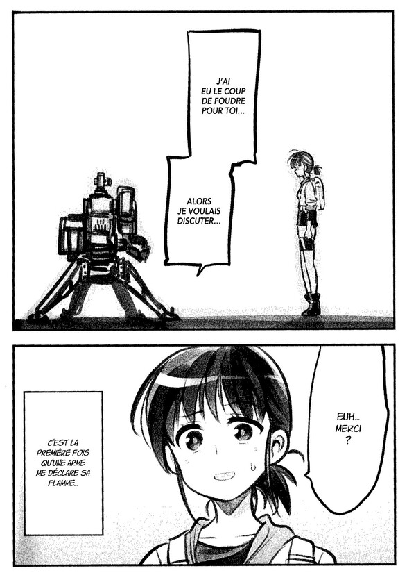 Ce tome 0 ne reflète pas la qualité du récit de Mechanical Buddy Universe, puisqu’il compile les épisodes initialement publiés en ligne par Takuji Kato, qui peuvent le plus souvent se lire indépendamment les uns des autres. Nous sommes donc plus face à une série de strips qu’à une histoire avec un fil rouge. Ils parviennent globalement bien à introduire l’univers et les différents personnages, mais les amateurs de récit au scénario soutenu resteront peut-être un peu trop sur leur faim. Néanmoins, les derniers chapitres annoncent le début d’une aventure plus complète, qui débutera avec le tome 1.