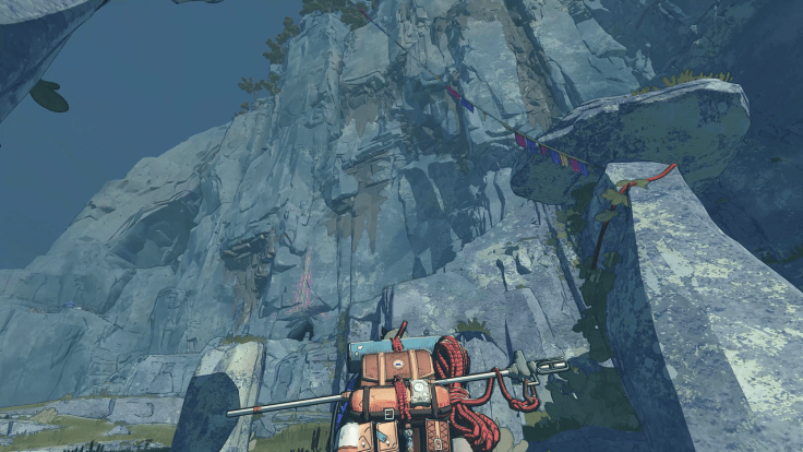 À cela s’ajoutent de nouveaux facteurs au fil de l’escalade. Il faut prendre en compte la faim et la soif, car, si Aava peut boire, il lui est impossible de manger en pleine ascension, sauf dans le cas où elle est vachée. En effet, l’inventaire du jeu est représenté par son sac à dos et sa capacité est très limitée. Celui-ci est intégré de façon diégétique, il fonctionne donc comme un élément de gameplay. Il est possible de boire ou de planter un piton lors de l’escalade, car ces éléments sont à portée de la main d’Aava.