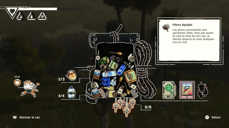 Pour accéder à son sac en revanche, l’héroïne dans l’obligation d’avoir ses deux mains libres pour pouvoir l’enlever de son dos. De plus, il faut avoir à l’esprit qu’en pleine montagne, la nourriture et l’eau ne se trouvent pas facilement. Il faut donc penser à se rationner et à couvrir ses besoins lors des moments les plus propices.