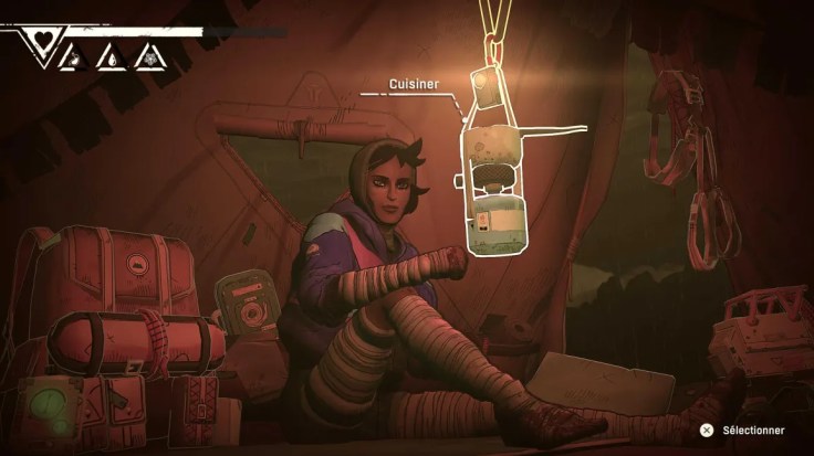 Une fois le bivouac monté, on dispose de plusieurs choix. Climbot permet d’utiliser deux pitons cassés pour en créer un neuf. Dormir passe le temps et régénère la barre de santé d’Aava, tandis qu’utiliser des bandages pour ses doigts améliore l’adhérence de ses mains.