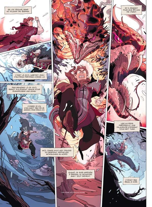 Côté action, Skara nous gâte avec une aventure qui démarre sur les chapeaux de roues et qui met en scène de belles tranches de bravoure. Pour autant, les passages plus mystiques, liés à la mythologie, dégagent une ambiance onirique douce et originale, et proposent une interprétation artistique fascinante. D’ailleurs, si l’album se veut avant tout une grande histoire de fantasy, il apporte beaucoup de détails et de soins aux informations historiques et culturelles liées à la Scandinavie du ixe–xe siècle qui lui sert de cadre. Une belle manière de continuer à faire vivre des mythes et légendes millénaires.