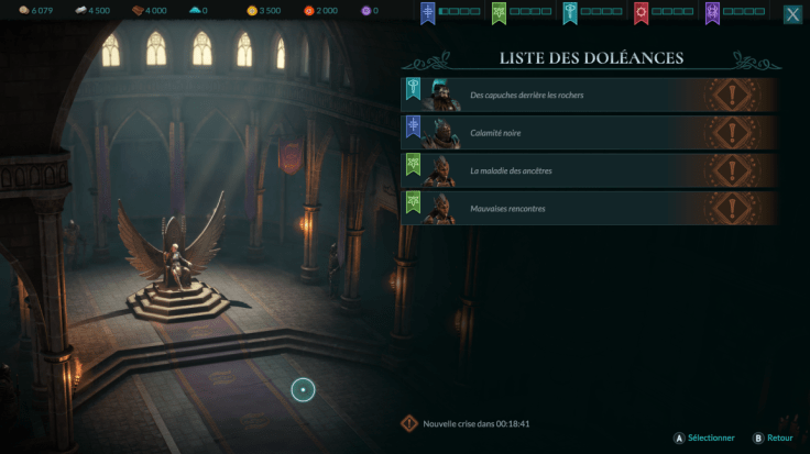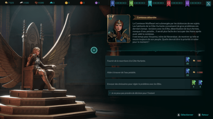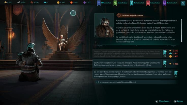 La grande nouveauté qui intensifie l’immersion, ce sont les doléances qui vont venir enrichir l’univers. Elles apparaîtront régulièrement via un compte à rebours et sont à gérer au trône d’Yllian. Chacune d’entre elles laisse place à une petite mise en scène qu’il faudra résoudre via plusieurs choix pouvant coûter ou non des ressources, et faire augmenter ou baisser la réputation des différentes factions du jeu.